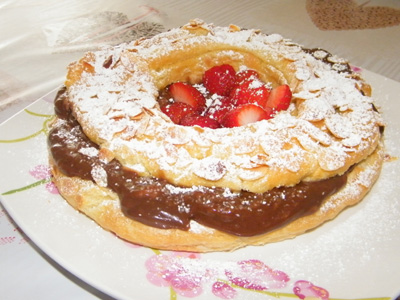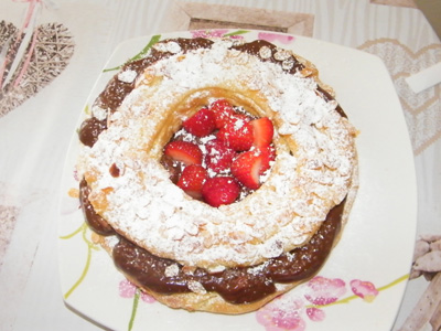 j'ai testé genre de paris-brest enfin pour la couronne reste c'est crème choco et fraises, chinois aux framboises et crème pâtissière, gâteau zébré, et une autre brioche hihi je tente des recettes un peu de tout genre au moins on s'en lasse pas y'as tjs un goût différent et la texture autre ;-)